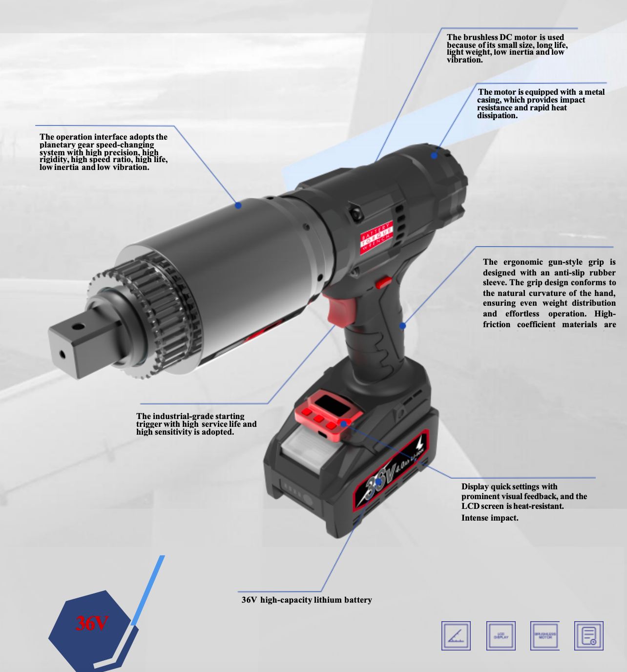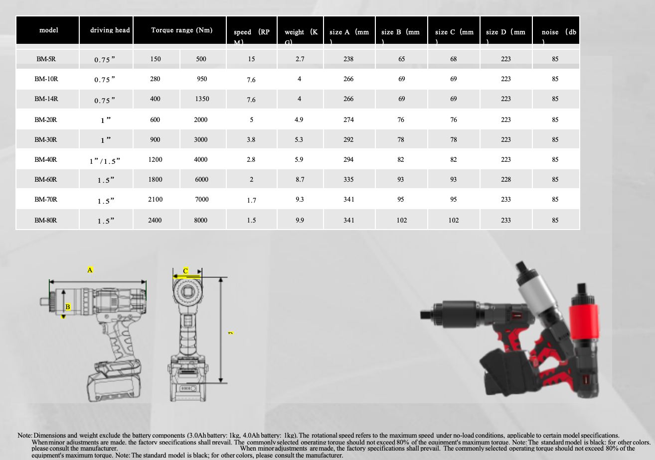 The BM-R series features next-generation high-power 36V brushless motors with carbon-free brushes, offering maintenance-free operation, enhanced durability, and compliance with stringent requirements for high precision, strength, and safety. It incorporates a planetary gear transmission system with high precision output ratios, paired with high-capacity batteries and fast-charging technology, achieving ±5% accuracy. The BMR series delivers robust performance and exceptional speed.