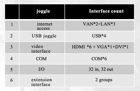 WAN port, LAN port, COM port, USB interface, and expandable I/O ports, etc.